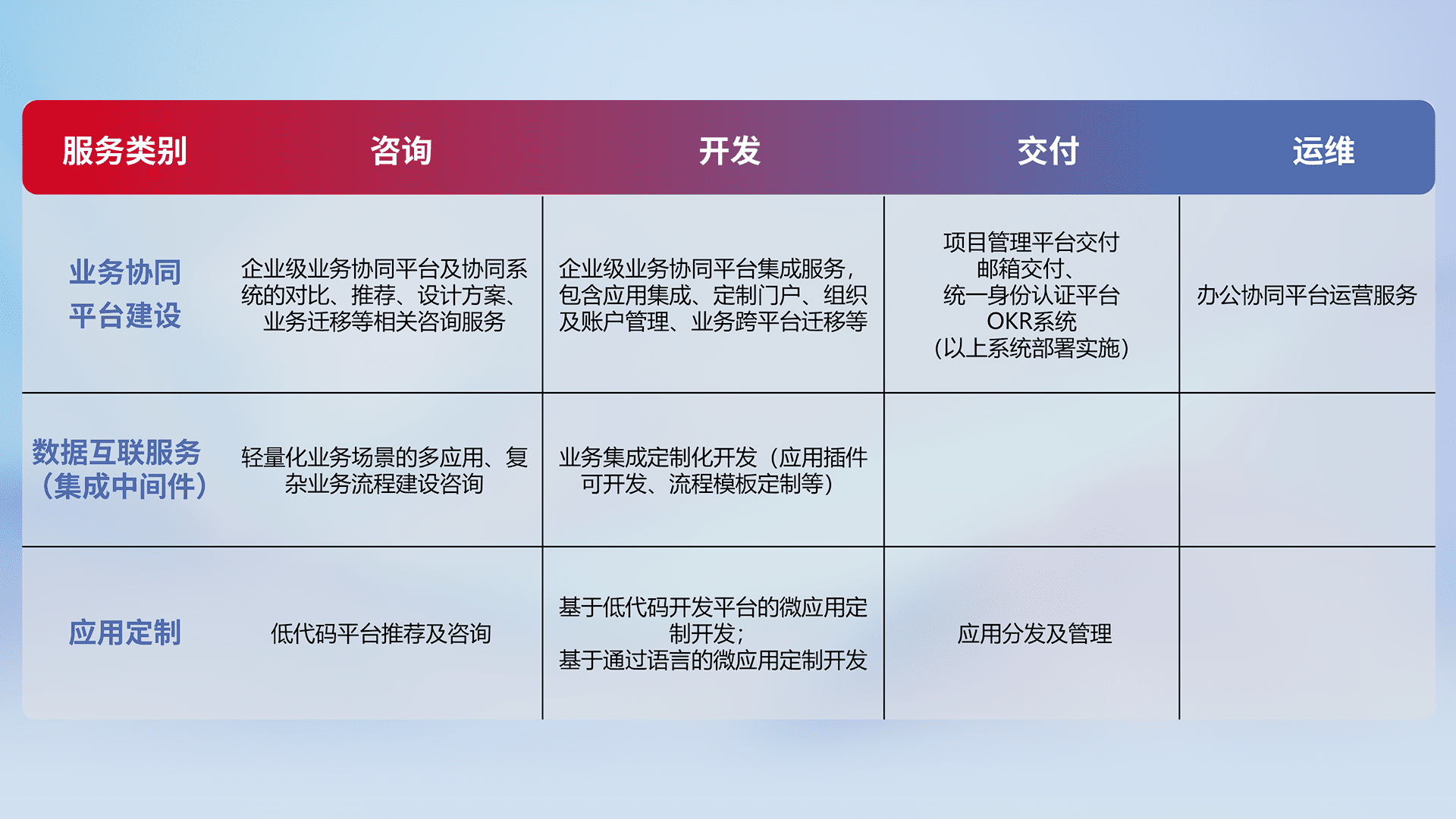 针对钉钉、、、企微、、、、IDaas等平台级产品提供产品的规划、、、方案、、、、交付、、、、定制化开发等服务,,,,实现如统一协同办公、、智能客户服务、、、混合会议管理、、、智能数据查询、、、、等业务场景,,,,实现数字化转型。。